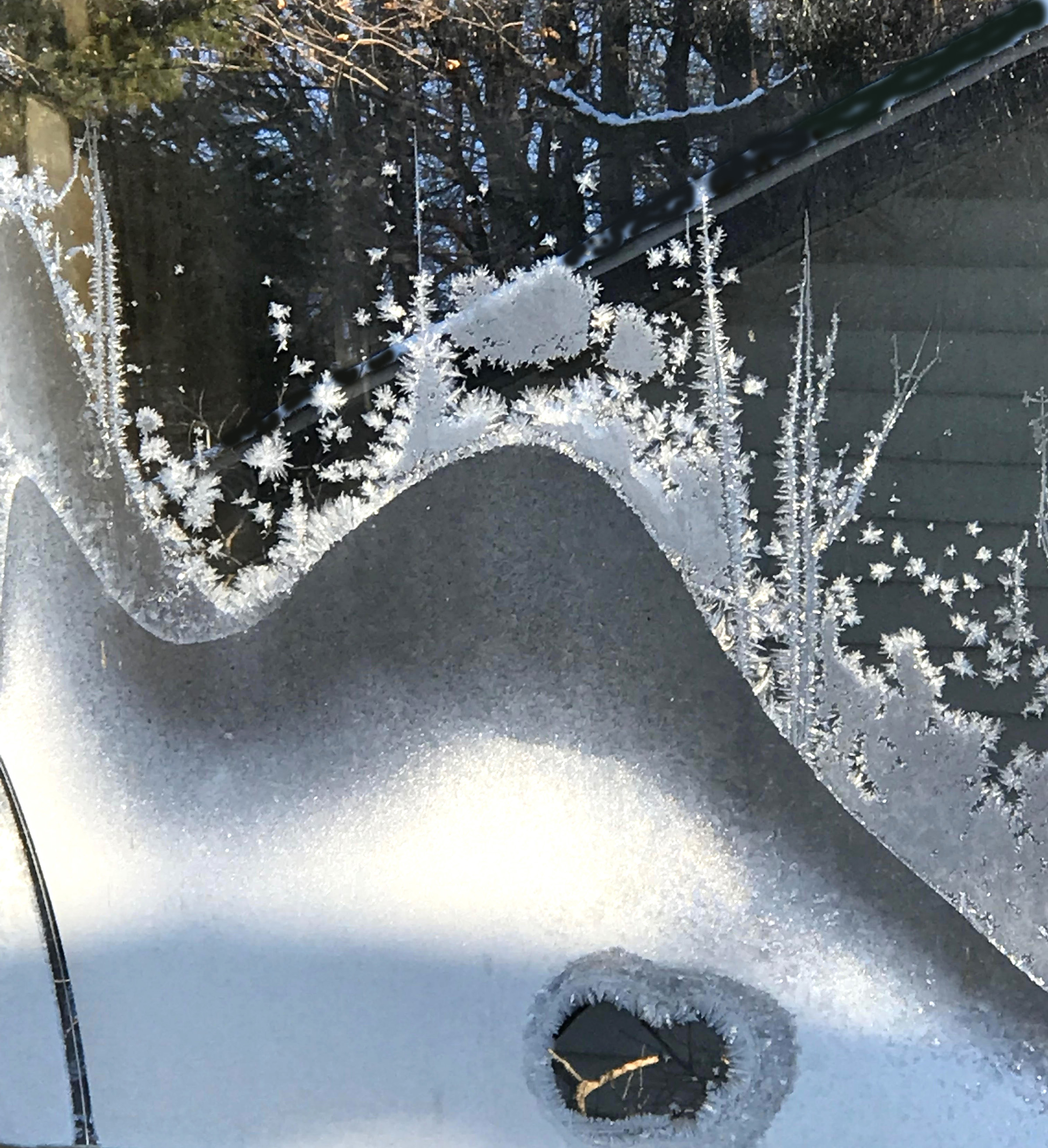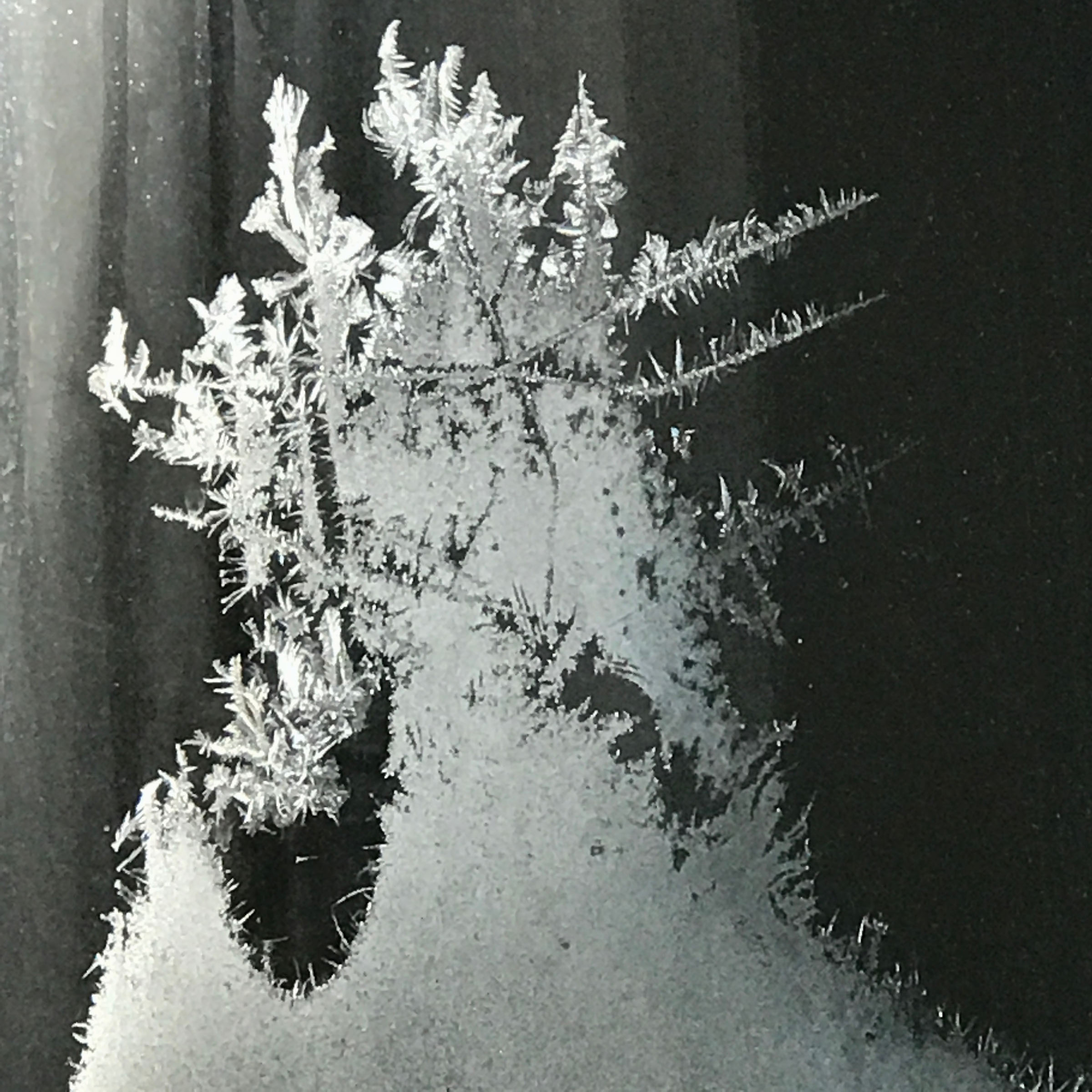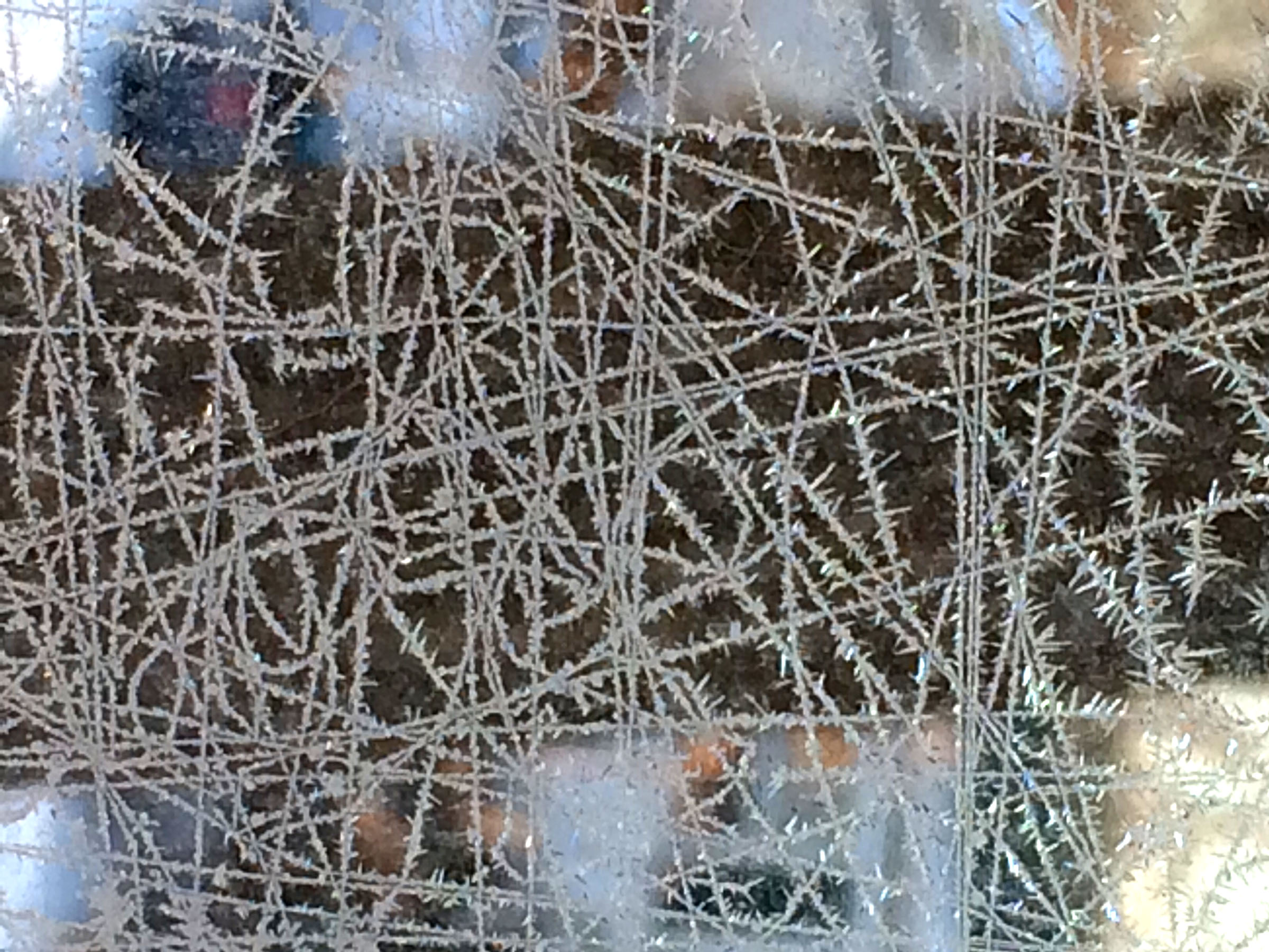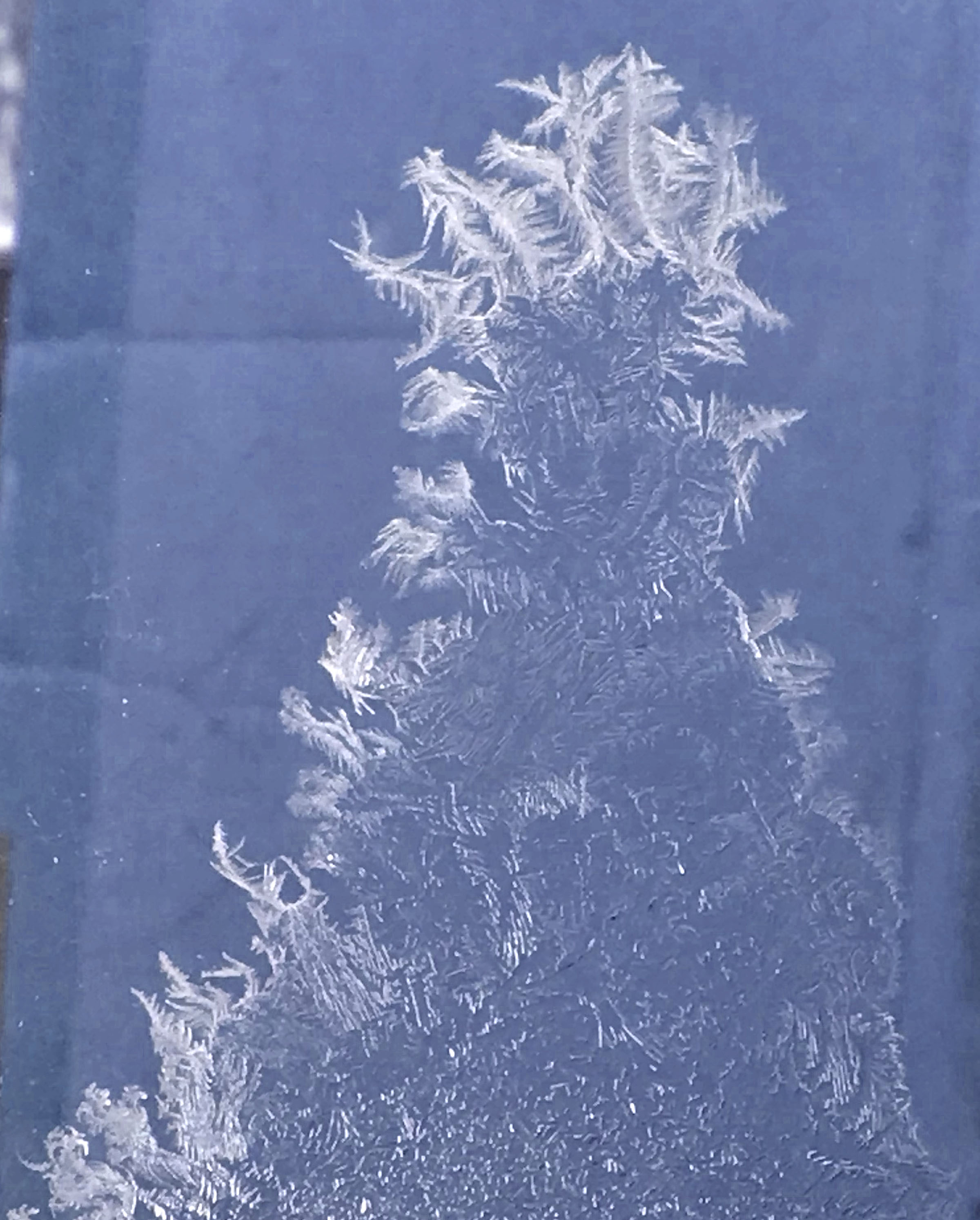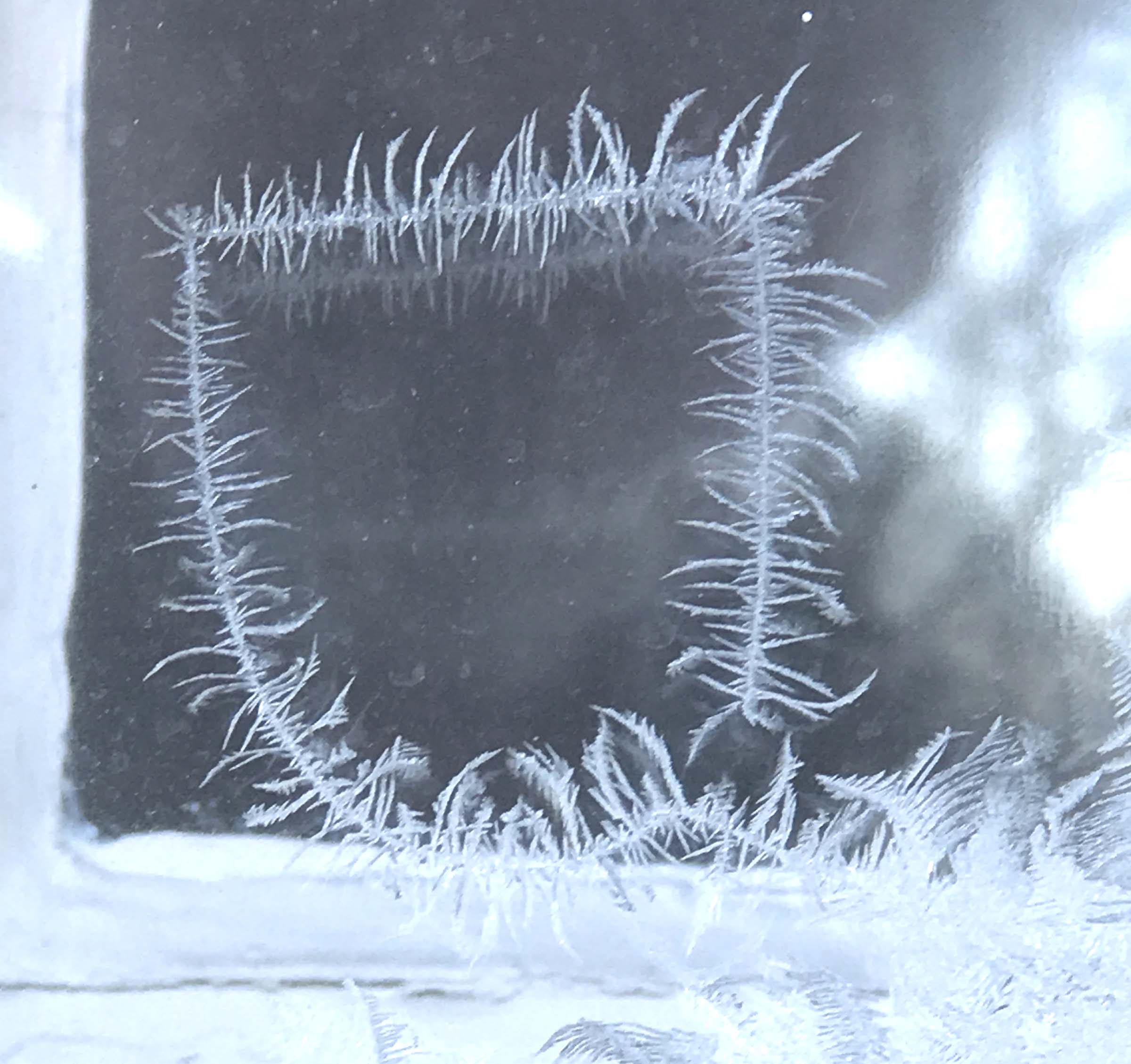 The frost patterns on my old, non-sealed, manual storm-glazed windows were fascinating as always: Are these frost lines built molecule by molecule showing us precise angles that exist at that very small level? How else can such a thin line be grown so straight? And then sometimes they curve, to follow perhaps the fine line of a window cleaner’s scratch? Some other lines must be following isotherm lines showing heat flow currents?