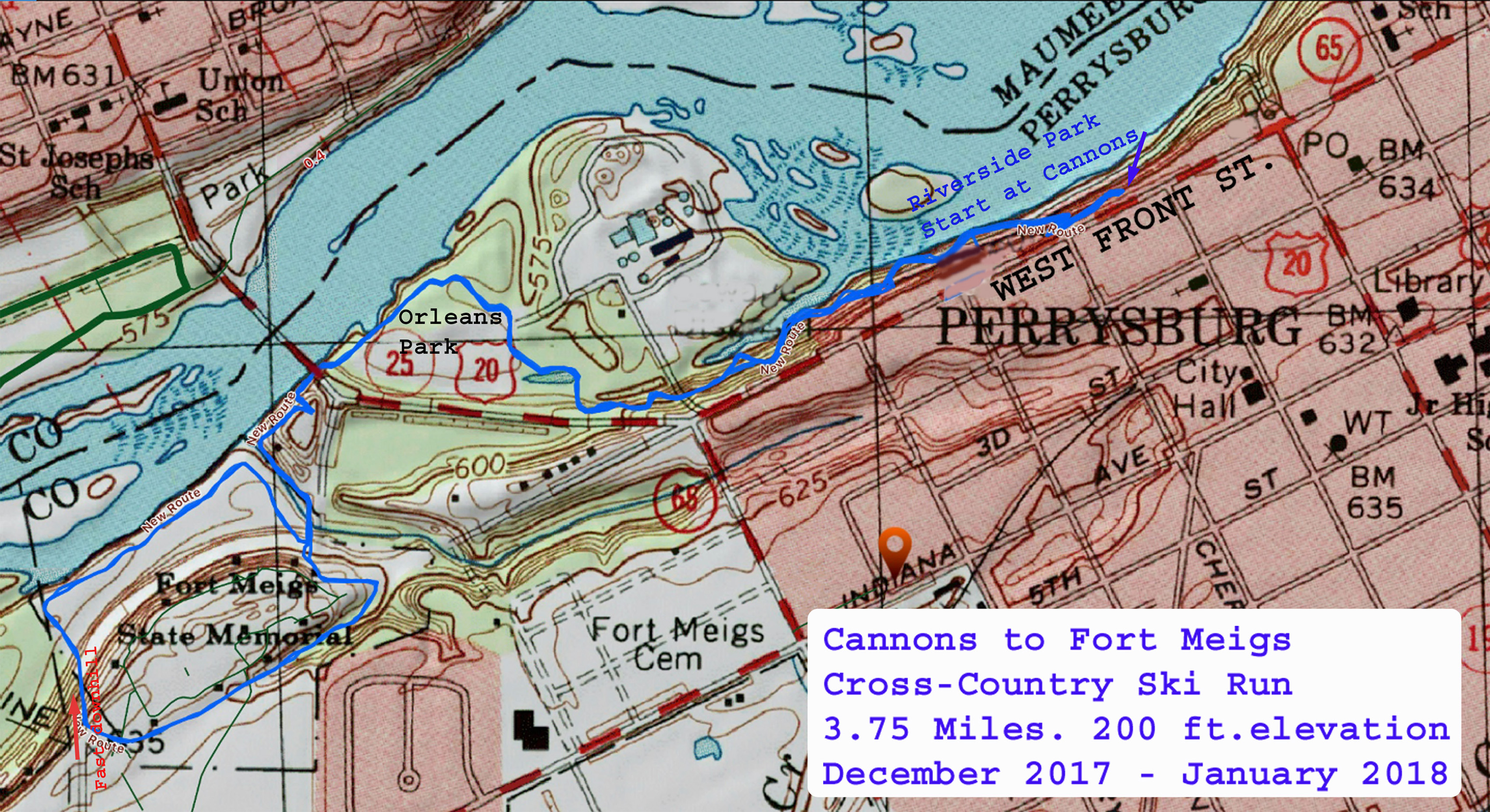 So here is this season’s Cross-Country Ski Map. From the Riverside Park Cannons to Fort Meigs and back is 3.74 miles, with an elevation change of reportedly about 200 ft.