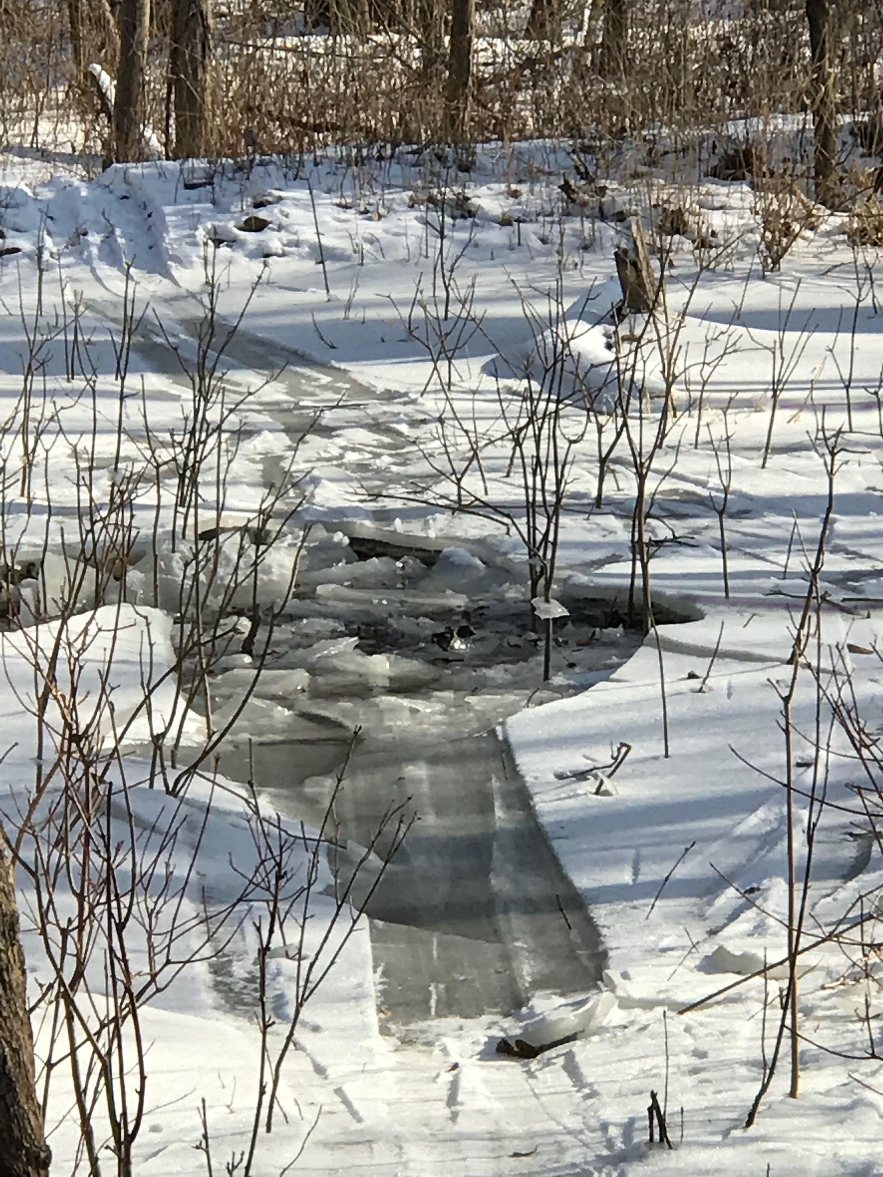 More unexpected adventures were had in the Orleans Park section. Four days ago the ice break up created a dam – the Maumee river rose, flooded my ski trail, froze, and then subsided, leaving a thick flat ice slab poorly supported by shrub stems and such. Under the ice was air, and then water below that. But the ice was unsupported by water and so had no strength. It all resulted in one very cold wet skier.