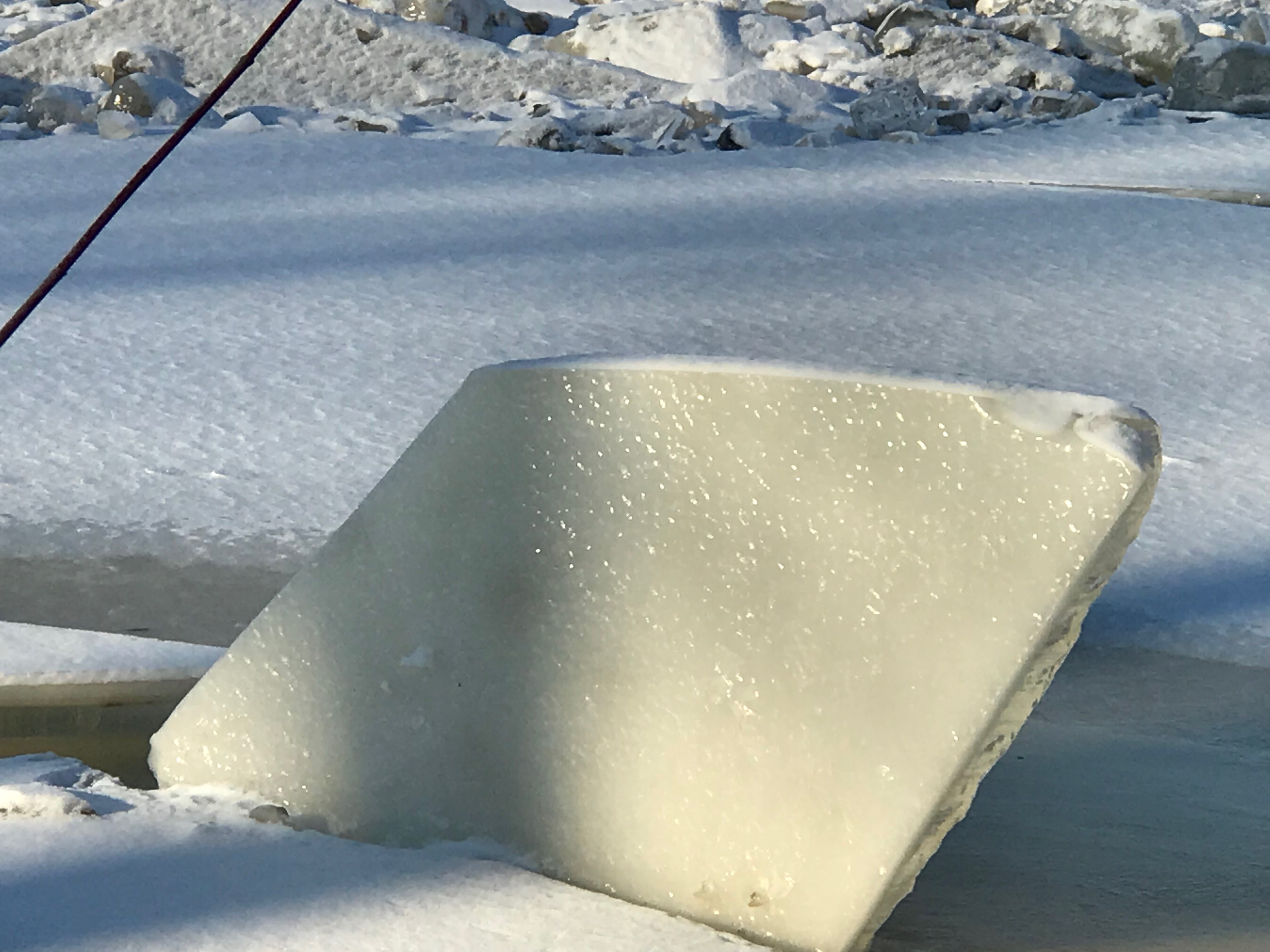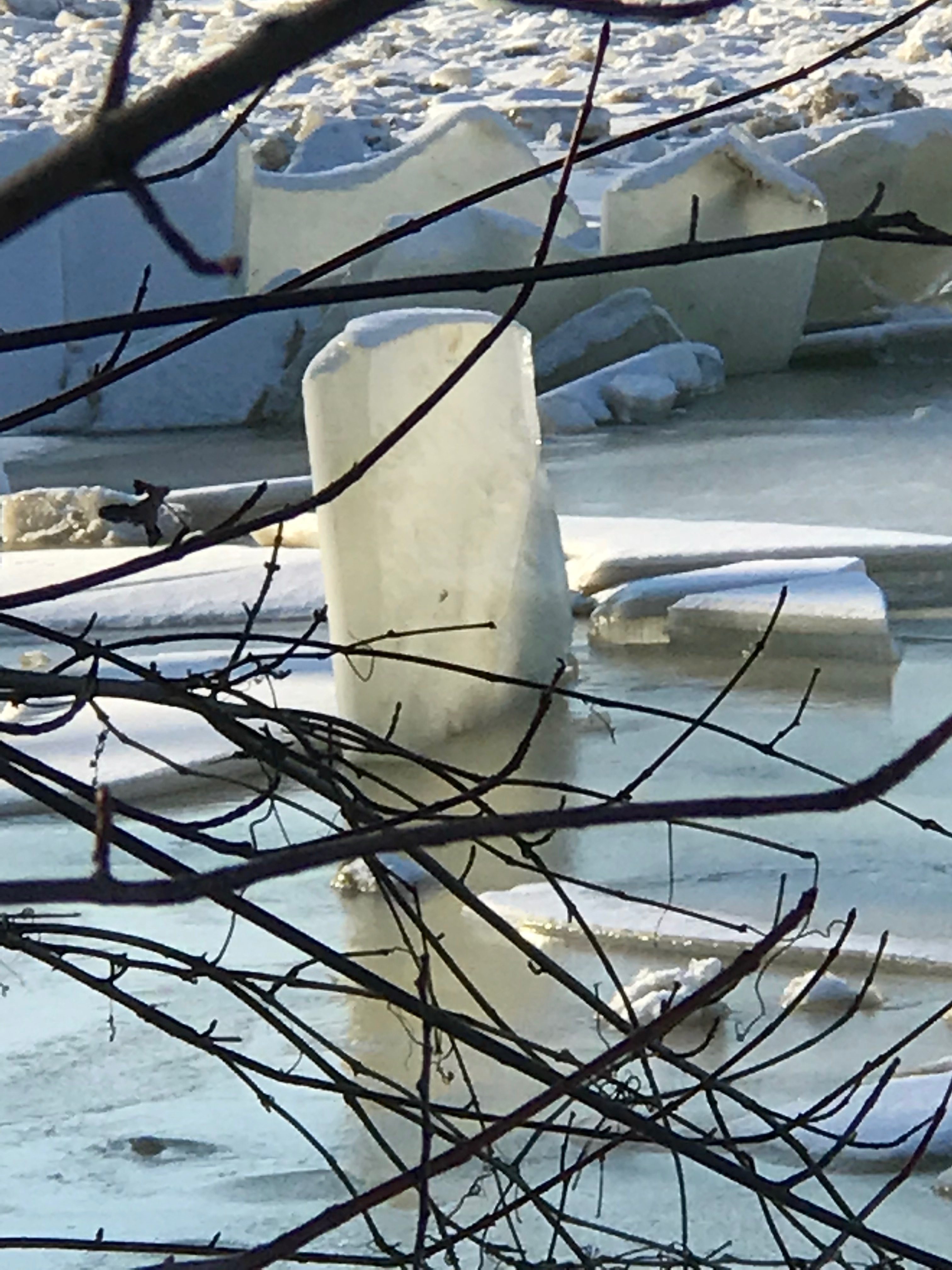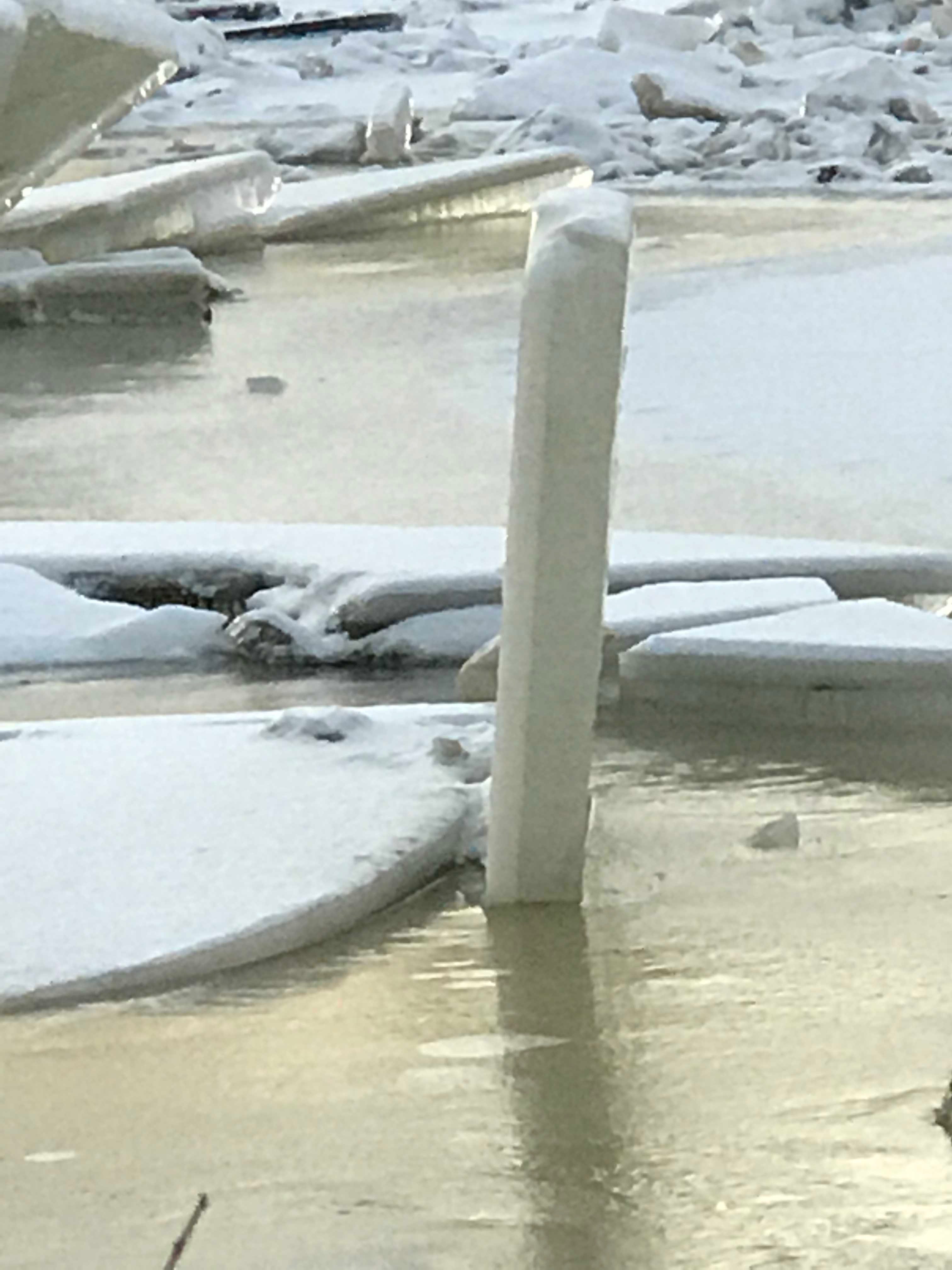 The top 4 or 5 ft. of this vertical slab of ice, about 50 ft. away, viewed edge-on in the photo above with the camera pointing due North, and with its lower edge firmly resting about 6 ft. underwater in the Maumee mud, has a strange perspective property. When seen from about 15 deg. to the right side (camera pointing NNW) it seems to tilt slightly to the left. See photo below: